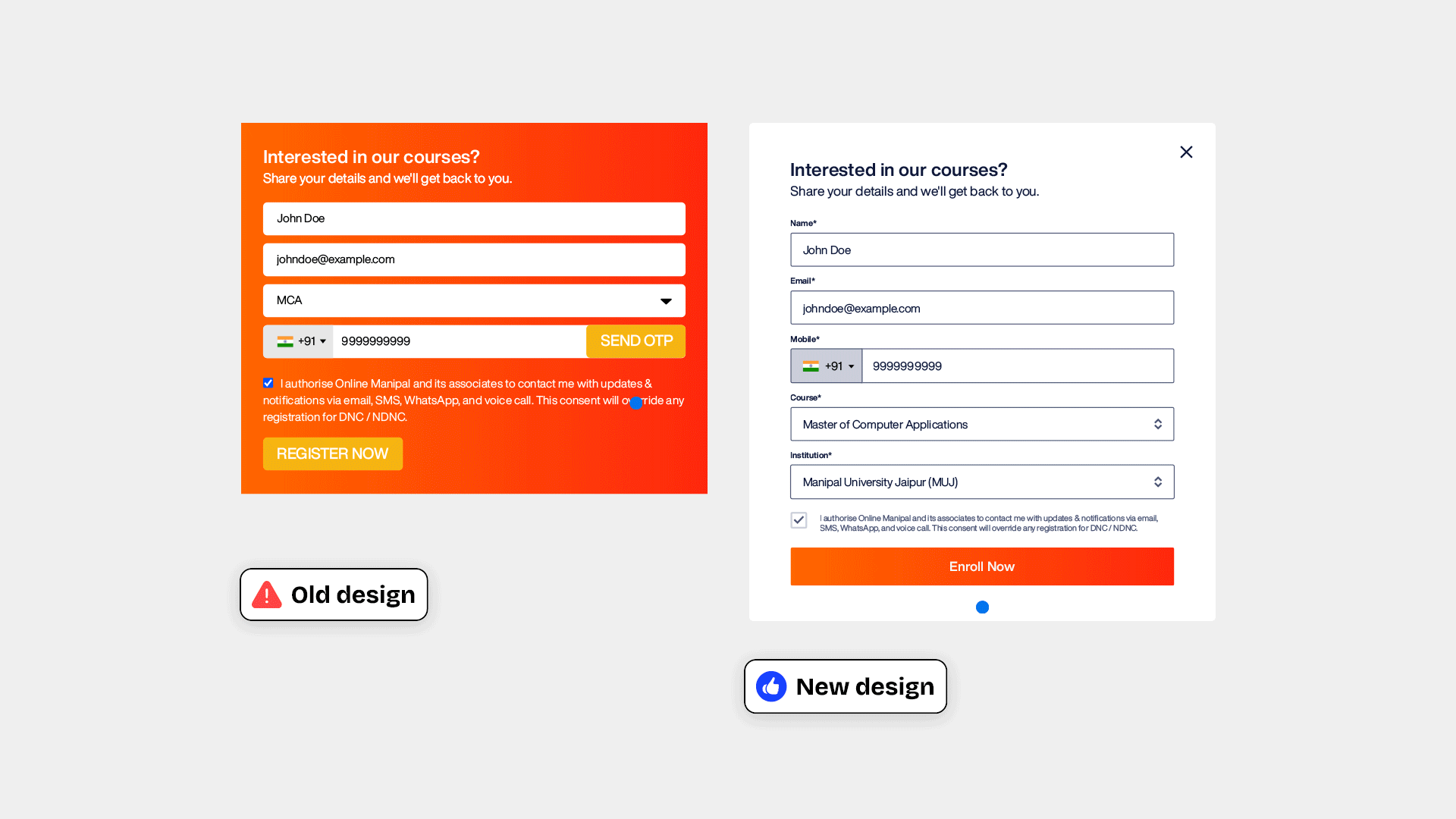 Problem: The old design had a ‘Send OTP’ button beside the phone number field. The learners often clicked on the final submit button without clicking on Send OTP and it would result in the form throwing an error and drop offs.